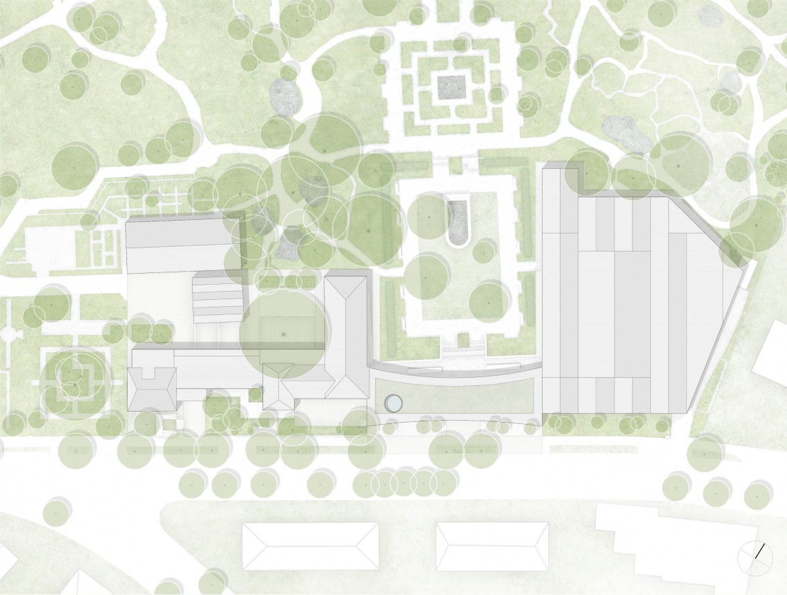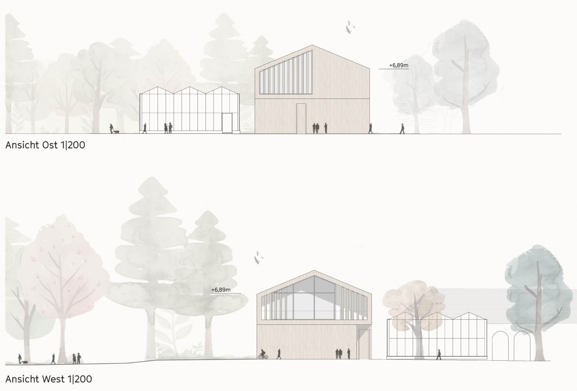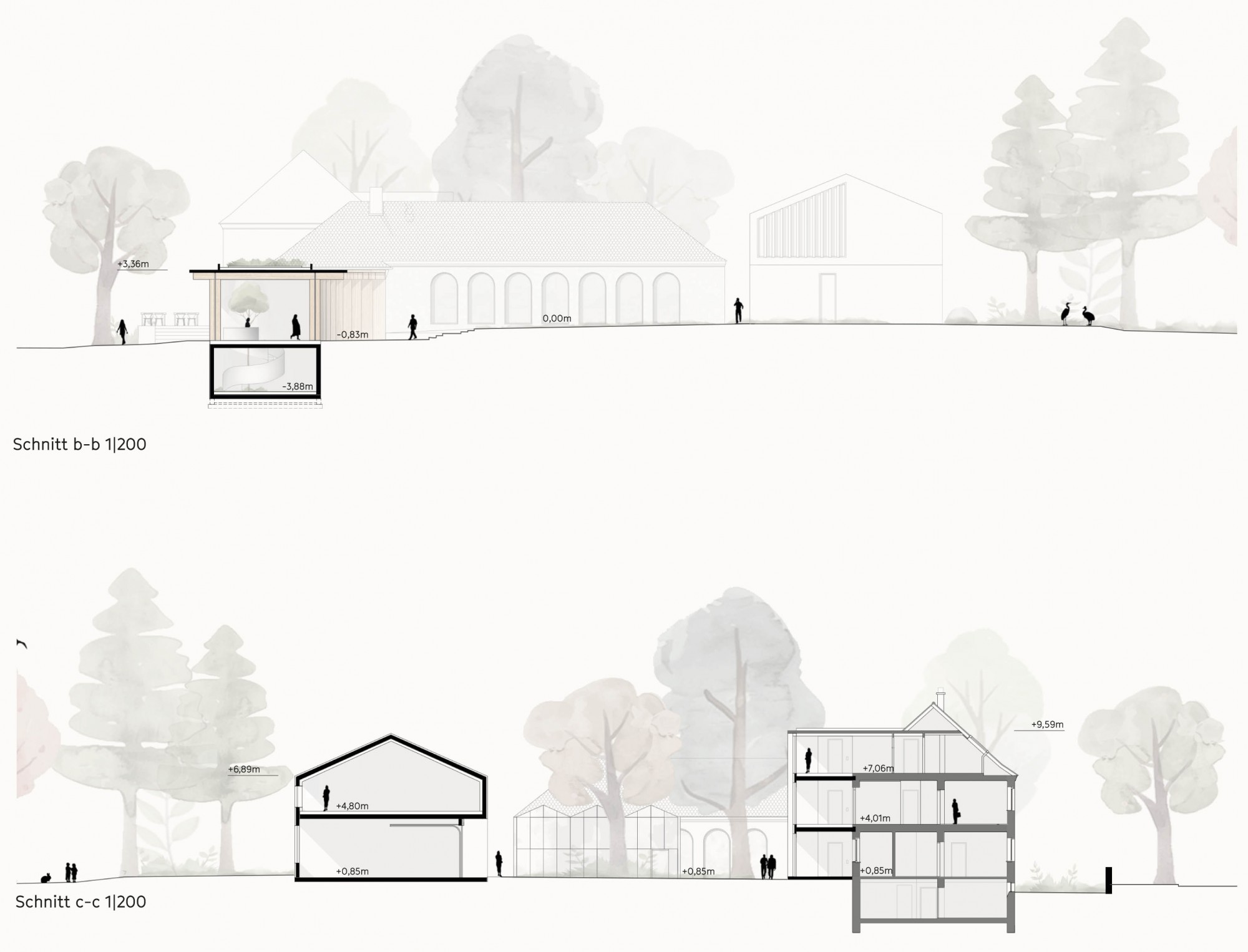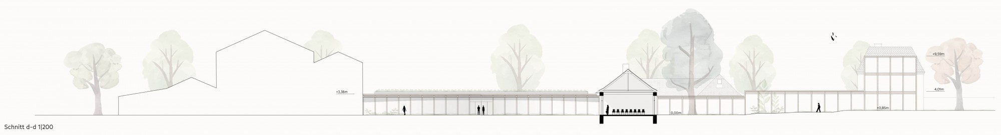 Die städtebauliche Setzung optimiert den Nutzungsbereich zwischen Besuchern und Mitarbeitern/Gärtnern und respektiert die historische Struktur des Formalgartens. Die zentrale Freitreppe wird in ihrer historischen Lage und Symmetrie wiederhergestellt; die barrierefreie Erschließung erfolgt über neue seitliche Rampen entlang des Formalgartens. Im Ideenteil entsteht ein neu organisierter Wirtschaftshof: Werkstätten, Lager und Garagen im Erdgeschoss sowie ein heller, nutzungsflexibler Sozialtrakt mit Aufenthaltsbereichen und Terrassen im Obergeschoss. Teile des bestehenden Sozialtrakts werden zu einem lichtdurchfluteten Veranstaltungssaal umgebaut. Ein verglaster Korridor bzw. Wintergarten bildet eine verbindende Spange und schafft die barrierefreie Anbindung zur naturkundlichen Station. Das Cabrio-Glashaus dient dabei als saisonal flexibel nutzbares Bindeglied.