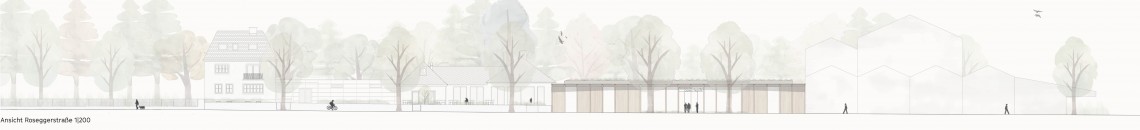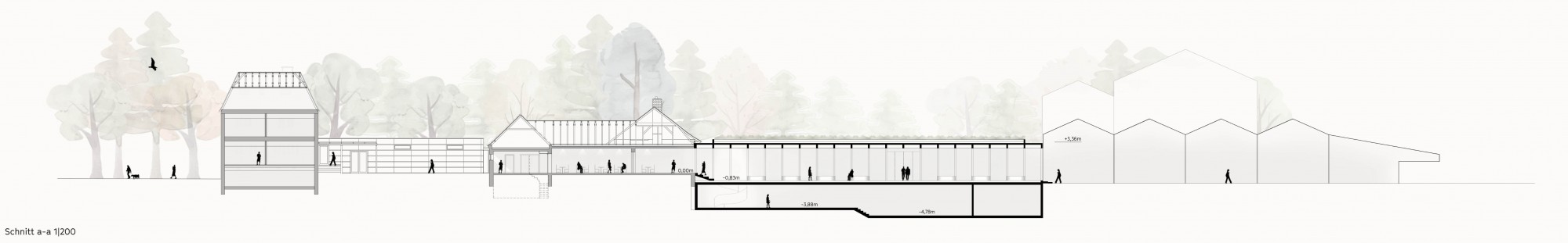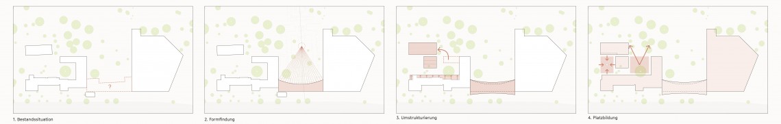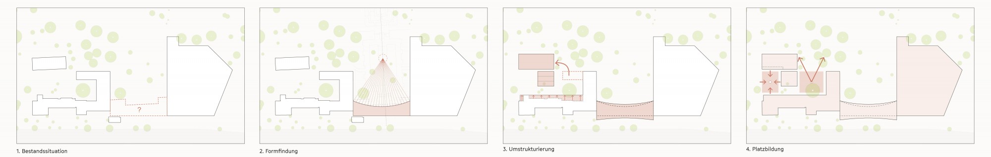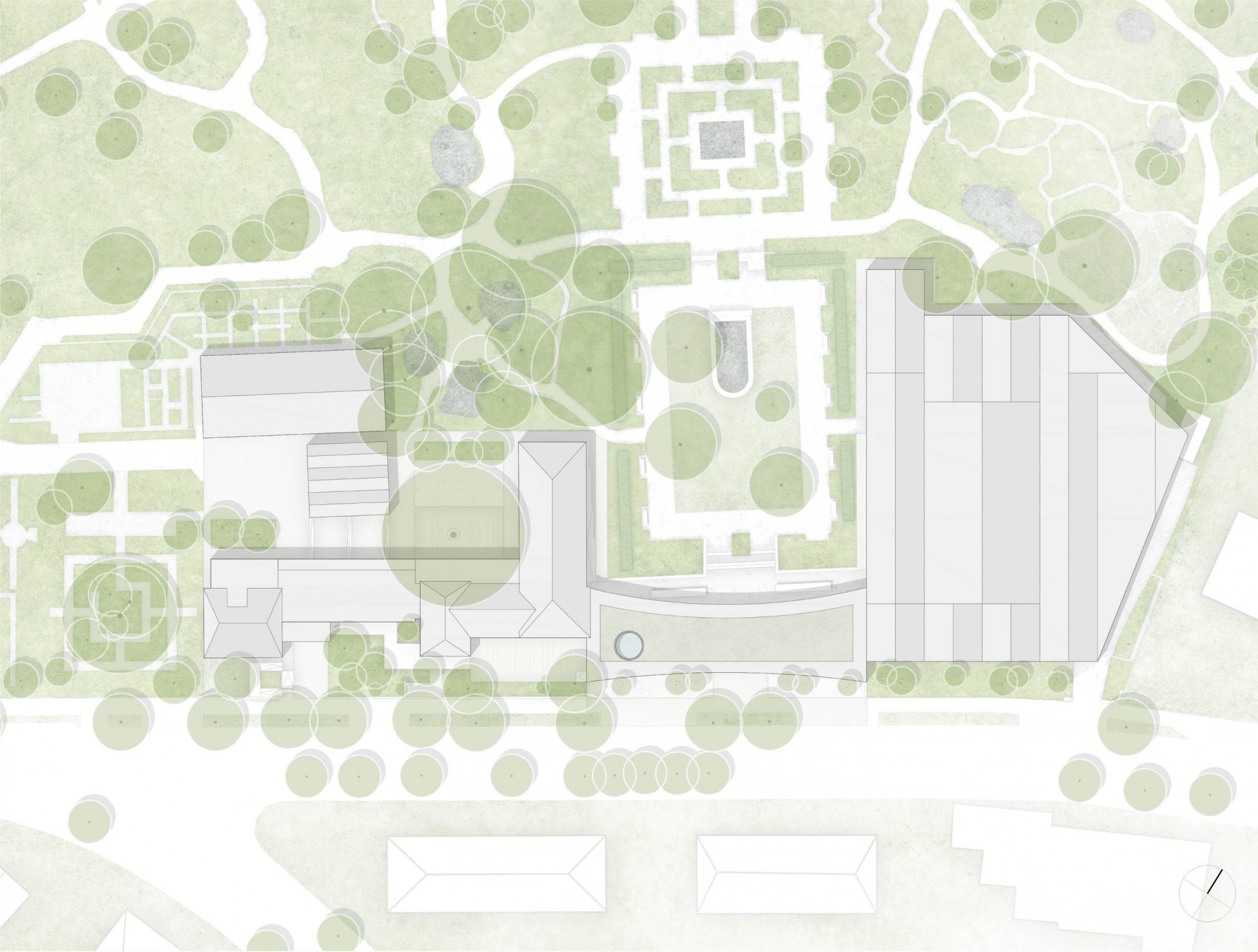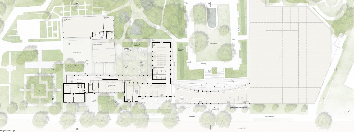 Die städtebauliche Setzung optimiert den Nutzungsbereich zwischen Besuchern und Mitarbeitern/Gärtnern und respektiert die historische Struktur des Formalgartens. Die zentrale Freitreppe wird in ihrer historischen Lage und Symmetrie wiederhergestellt; die barrierefreie Erschließung erfolgt über neue seitliche Rampen entlang des Formalgartens. Im Ideenteil entsteht ein neu organisierter Wirtschaftshof: Werkstätten, Lager und Garagen im Erdgeschoss sowie ein heller, nutzungsflexibler Sozialtrakt mit Aufenthaltsbereichen und Terrassen im Obergeschoss. Teile des bestehenden Sozialtrakts werden zu einem lichtdurchfluteten Veranstaltungssaal umgebaut. Ein verglaster Korridor bzw. Wintergarten bildet eine verbindende Spange und schafft die barrierefreie Anbindung zur naturkundlichen Station. Das Cabrio-Glashaus dient dabei als saisonal flexibel nutzbares Bindeglied.