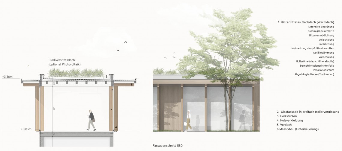 Auf dem Dach entsteht ein extensives Biodiversitäts-Gründach mit Retentionselementen, variierenden Substrathöhen, Grobkiesbereichen und Insektenhabitaten, dass die ökologische Qualität des Gebäudes steigert. Die Regenwassersysteme von Bestand und Neubau werden gekoppelt; überschüssiges Regenwasser wird in einer zentralen Zisterne gesammelt und zur Bewässerung der Gartenflächen genutzt. Das Gesamtkonzept schafft damit eine nachhaltige, funktionale und atmosphärisch starke Ergänzung zum Botanischen Garten Linz.
