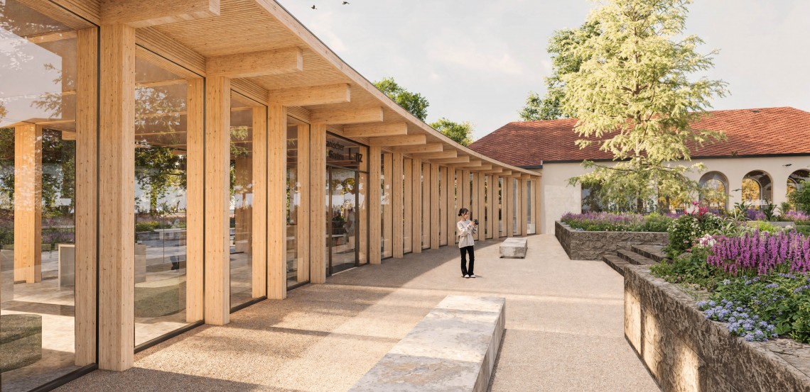 Das neue Eingangsgebäude bildet den zentralen Dreh- und Angelpunkt des Botanischen Gartens und verbindet das Glashaus mit dem Bestandsgebäude. Die klare Bogenform nimmt die Symmetrie der Gartenanlage auf und öffnet ein weites Panorama in die Freianlagen. Durch die transparente Architektur mit Holz, Glas und feinen Lamellen entstehen helle Innenräume, die fließend mit dem Außenraum verbunden sind. Der Vorplatz wird durch ein auskragendes, elegant geschwungenes Vordach definiert, das Besucher willkommen heißt und eine einladende Geste zum Botanischen Garten schafft.